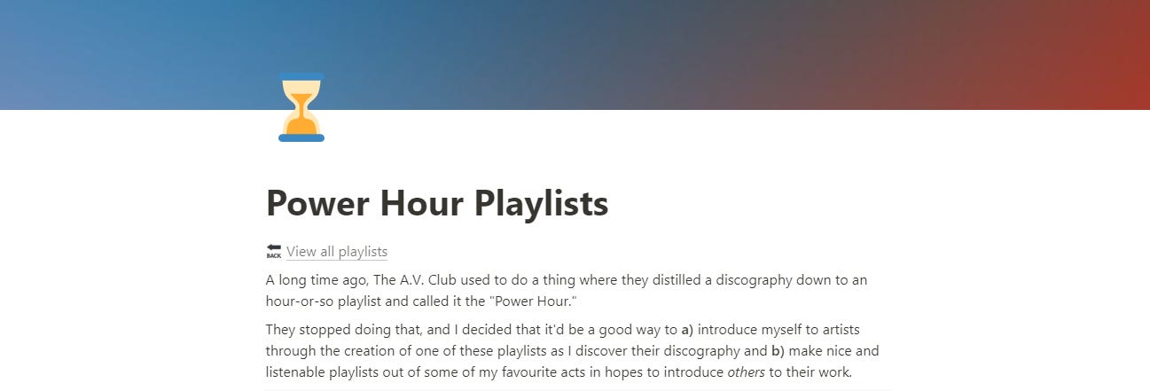 As I’m wont to do lately, I’m combining a bunch of scattered items into one newsletter for your reading and listening pleasure. I’ve got a brand-new mixtape waiting for you at the bottom of the page, but before then enjoy some Power Hour playlists and album reviews.