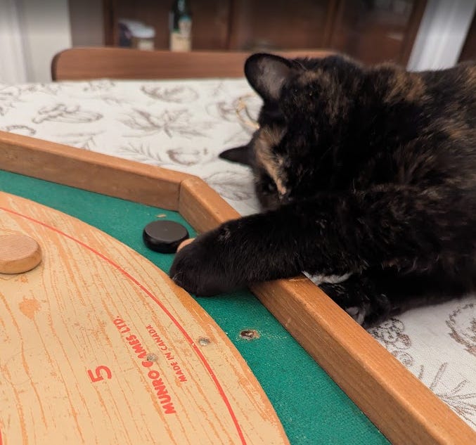 We have been playing some Crokinole here and there, which I really enjoy. Here’s Maple desperately trying to find a way to be involved in our game the other night: